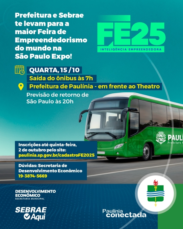 A Prefeitura Municipal de Paulínia e o SEBRAE chamam a todos empreenderores de Paulínia para irem até à Feira do Empreendedorismo que é a maior feira do setor do mundo, realizada em São Paulo, na São Paulo EXPO.